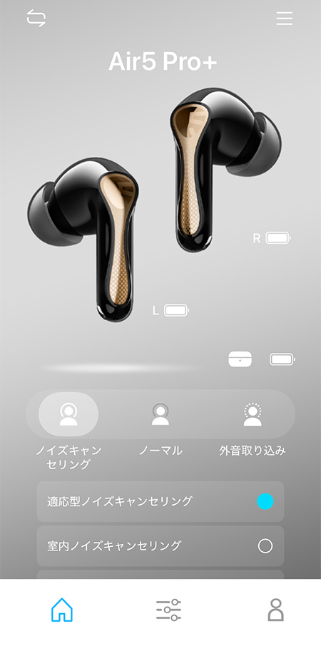 ノイズキャンセリングの切り替えや、イコライザーの設定などは、専用アプリ「PeatsAudio」で行います。 アプリ自体の使い勝手に大きな不満はないのですが、文字と背景のコントラストが弱く、見づらい点は改善して欲しいものです。
