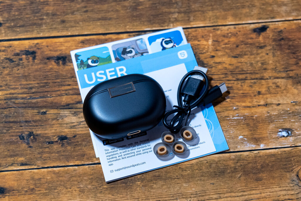 SOUNDPEATS Air5 Pro+のケースはシンプルなブラック。イヤホン本体以外には、ケース、USB-Cケーブル、イヤーピース3サイズ(1サイズは取り付け済み、その他2サイズが同梱)、取扱説明書が同梱されています。