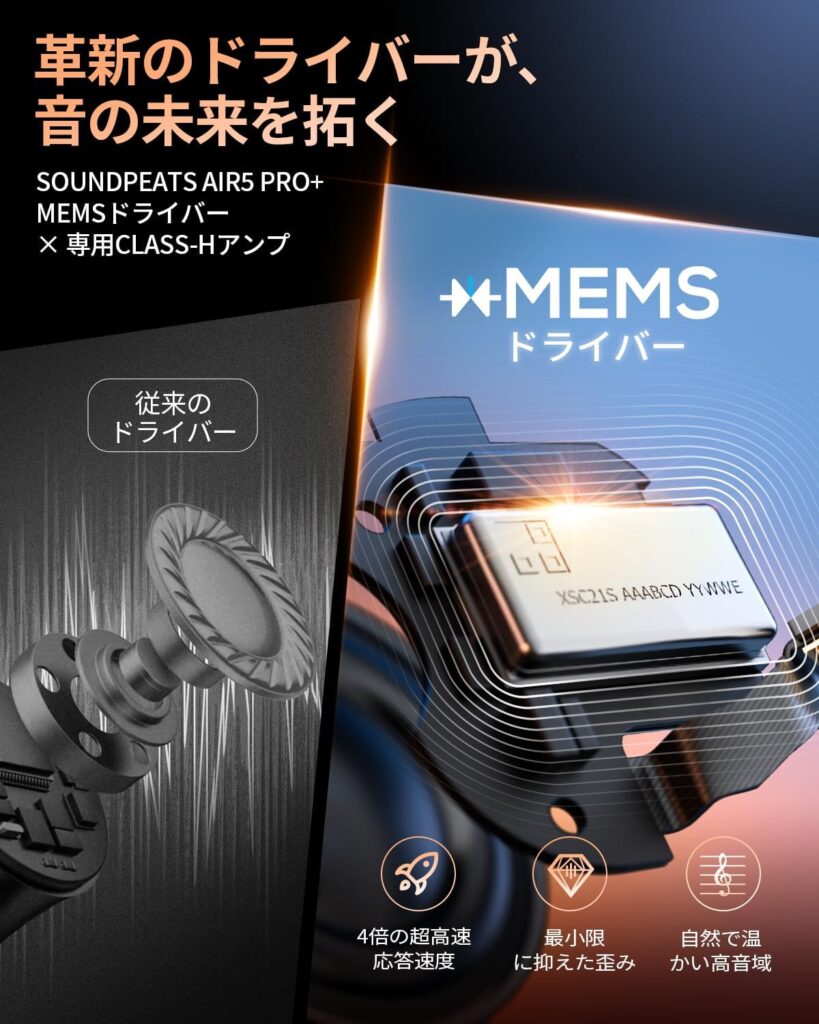 SOUNDPEATS Air5 Pro+は、「革新的MEMSドライバーと最先端プラットフォームで、高解像度サウンドと高性能ANCを両立したワイヤレスイヤホン」というコンセプトのもと、音質・ANC・機能のすべてを磨き上げた、ブランドの上位モデルです。