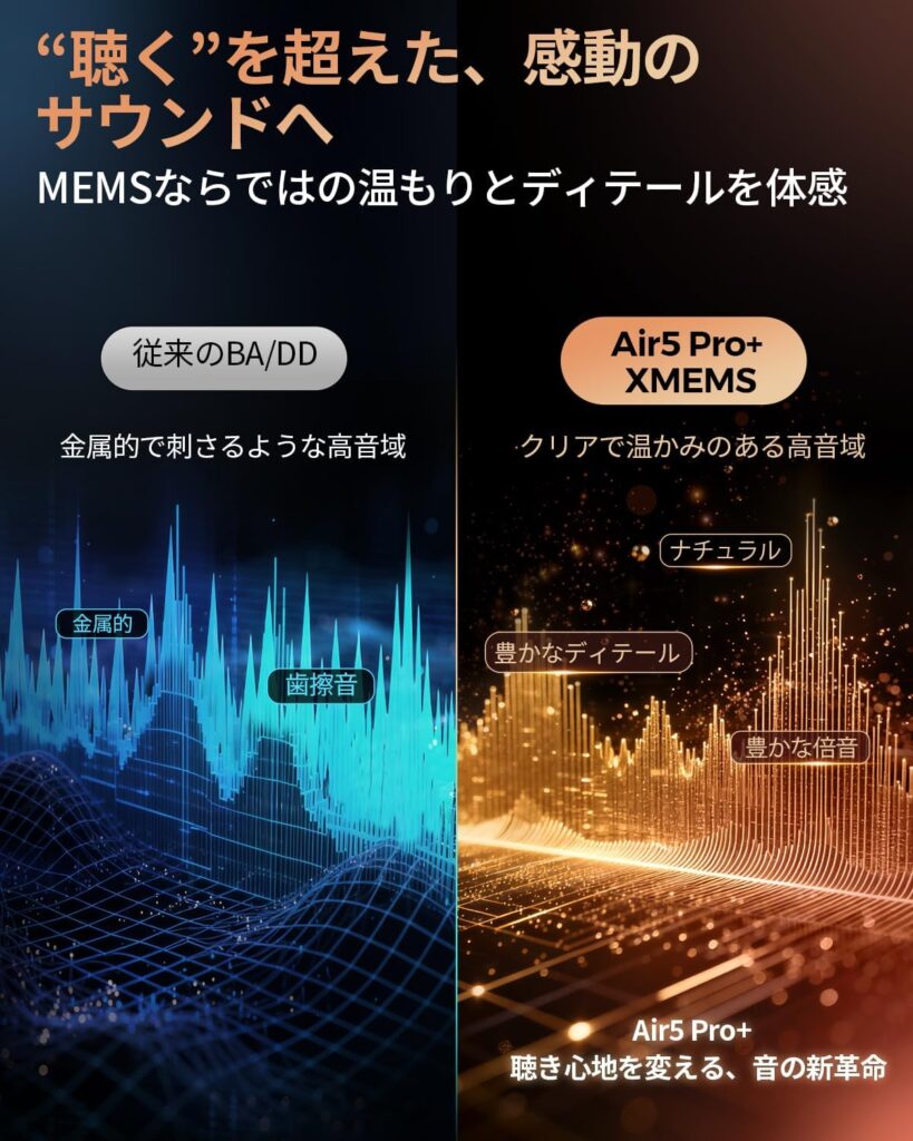 MEMSドライバーが中高音の繊細さを、ダイナミックドライバーが低音の力強さを担っています。